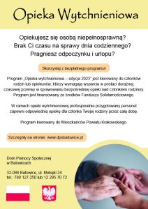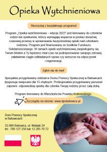 Osoby zainteresowane zapraszamy do zapoznania się z postanowieniami programu „Opieka wytchnieniowa” edycja 2023 oraz informacjami dotyczącymi programu, które dostępne są na stronie internetowej Powiatowego Centrum Pomocy Rodzinie w Krakowie pod adresem www.pcpr.powiat.krakow.pl oraz stronie Domu Pomocy Społecznej w Batowicach pod adresem www.dpsbatowice.pl